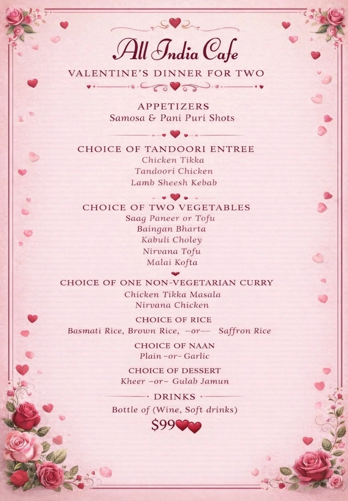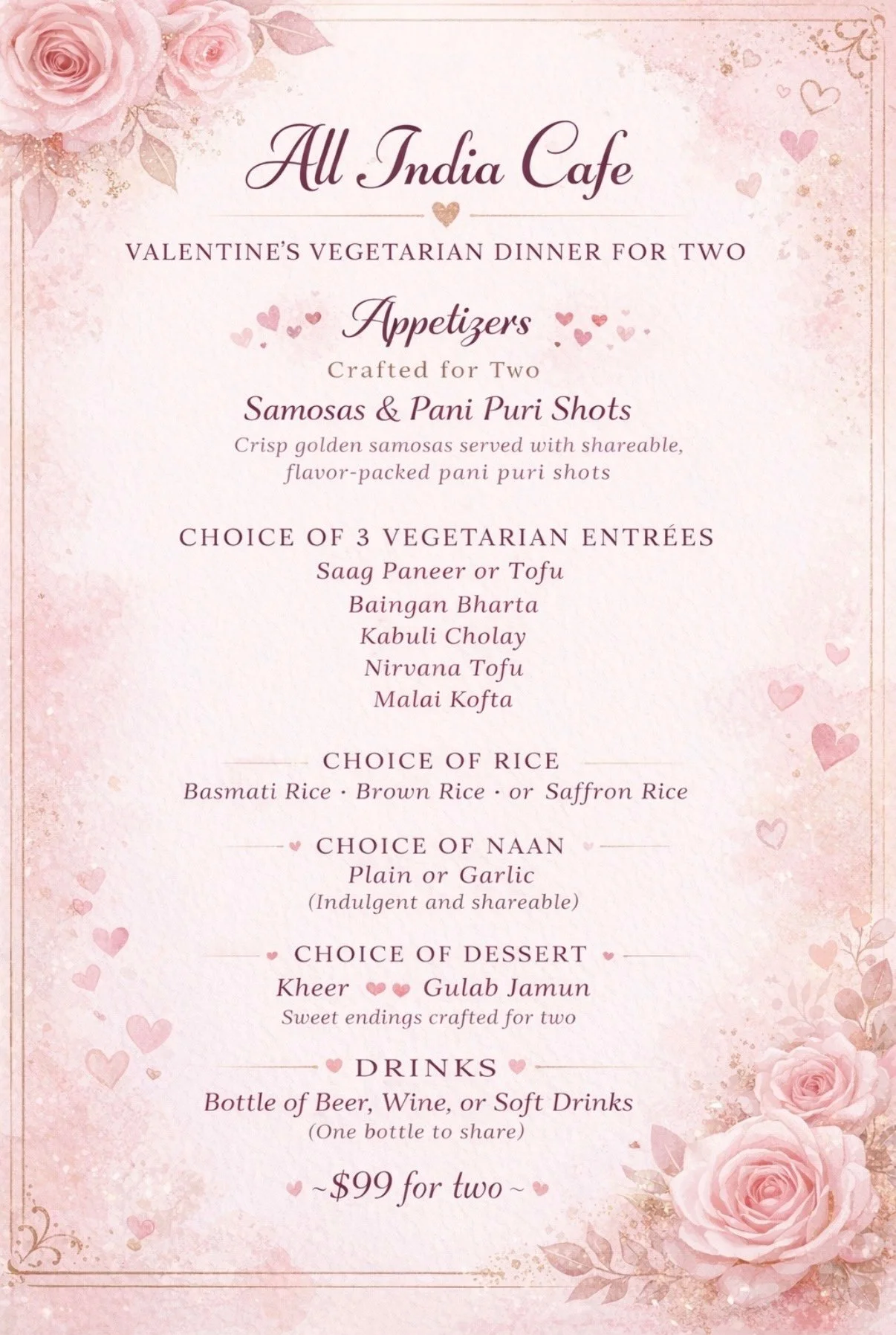 Celebrate your love with your favorite eats, festive drinks, and an alluring atmosphere. Our delectable Valentine’s Day specials are available for a limited time at All India Cafe Pasadena, All India Cafe Glendale, and All India Cafe Arcadia.